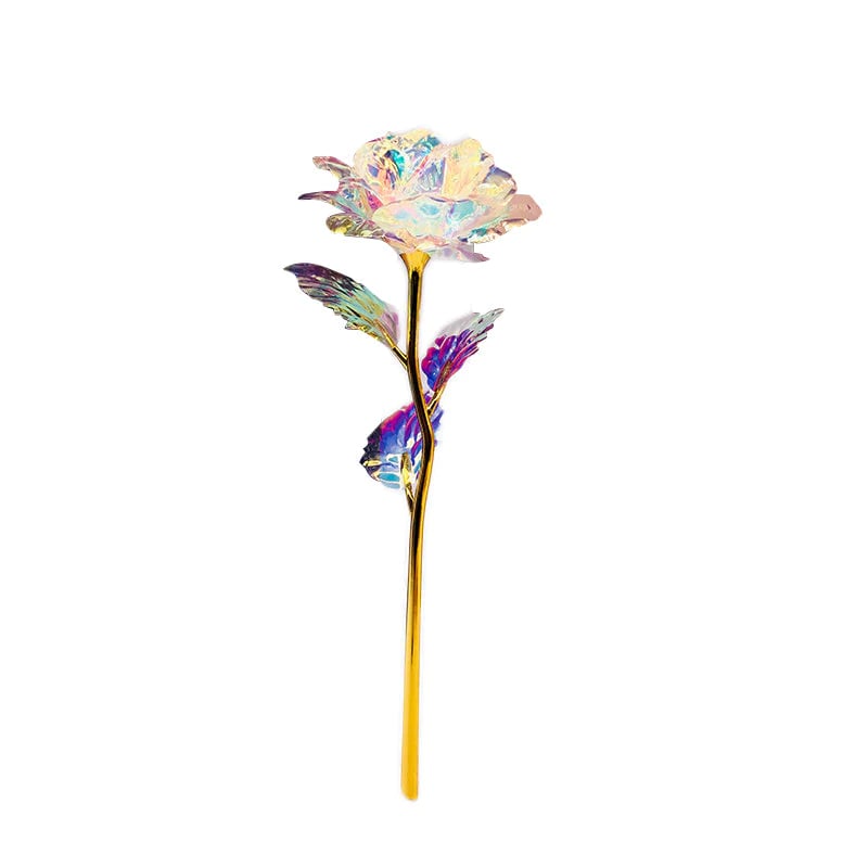 Schließlich überziehen wir sie mit einer schillernden holografischen Beschichtung, damit der Rosen-PVC-Stiel und die PVC-Blütenblätter im Licht funkeln. Dann platzieren wir jedes schillernde, holografisch beschichtete Blütenblatt von Hand, wodurch die Rosen so auffällig aussehen!