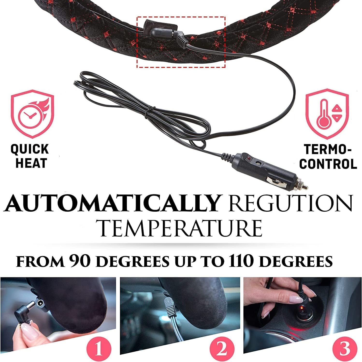 UNIVERSELLE PASSFORM – Die 15-Zoll-Lenkradabdeckung ist universell passend für alle gängigen 14,5-15-Zoll-Lenkräder. Sie sorgt für einen festen Sitz, sodass Sie sich keine Sorgen machen müssen, dass sie vom Lenkrad rutscht. Darüber hinaus reguliert der Thermostat automatisch die Temperatur.
