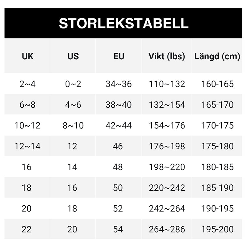 Größen: S (45-50 kg), M (50-57,5 kg), L (57,5-65 kg), XL (65-72,5 kg), 2XL (72,5-80 kg), 3XL (80-87,5 kg), 4XL (87,5-95 kg), 5XL (95-105 kg)