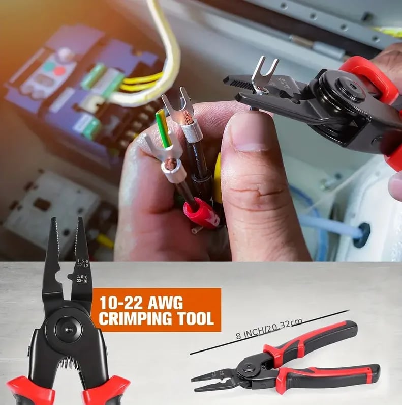 - Merkmale: Abisolierzange 10-22 AWG + Crimpzange 10-22 AWG + Begrenzungszange + Blechschere + 1 Diagonalzange